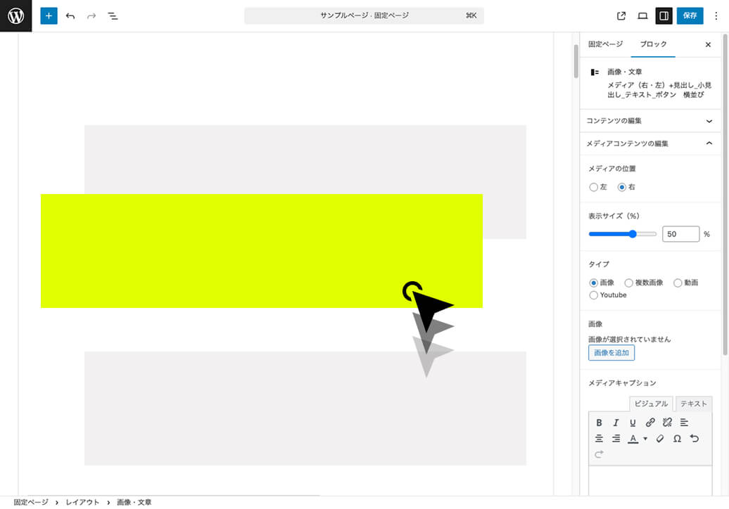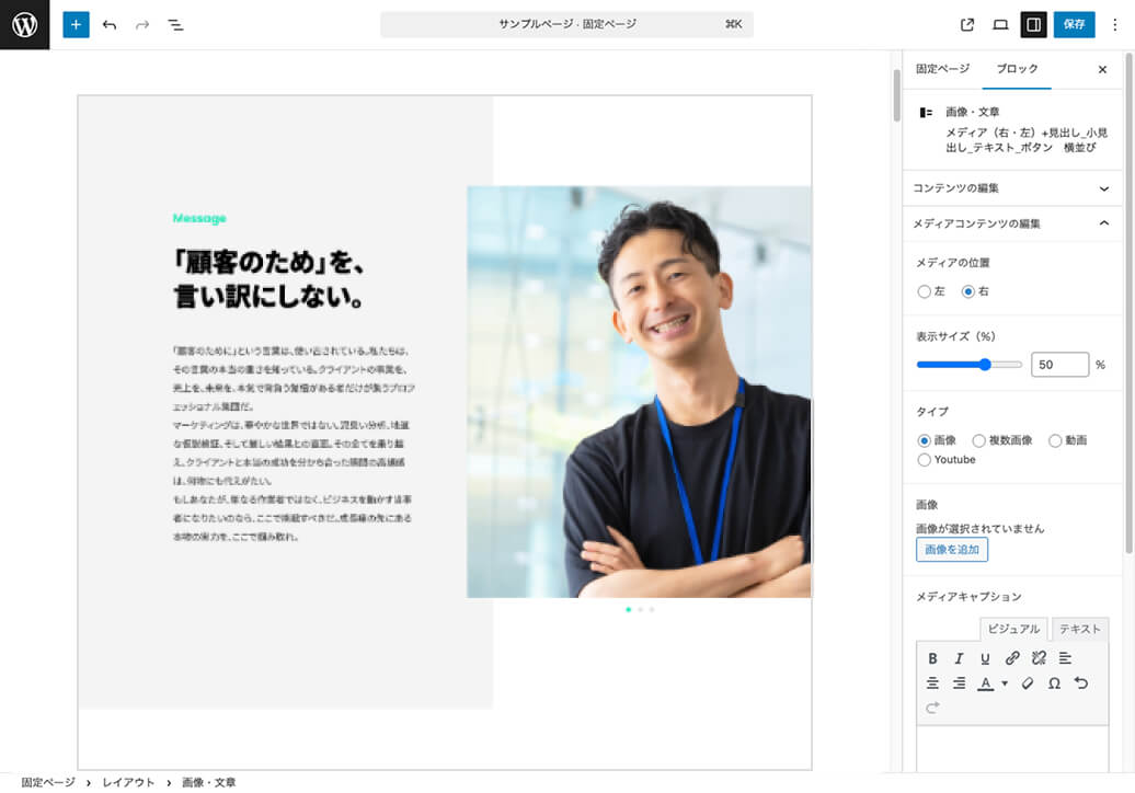 カスタマイズに自由度が高いUnrepブロックで、クライアントの要望に応じた柔軟なカスタマイズもコーディングの手間なく直感的に行えます。