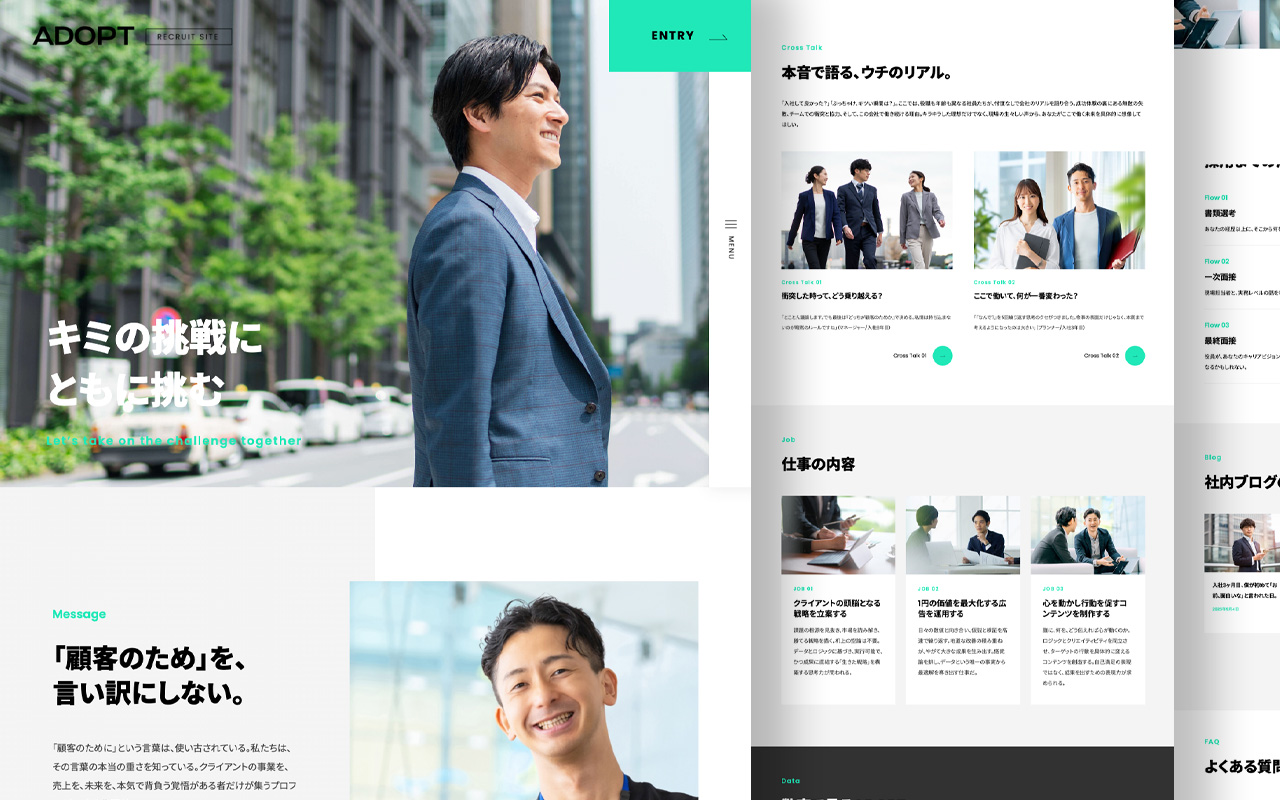 採用サイトに使えるデザインで、時短が可能に。採用サイトの他にもコーポレートサイトにも対応しています。